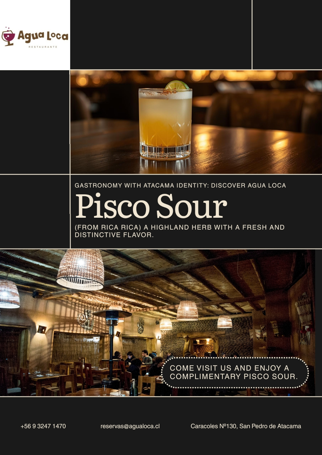 Só por nos visitar, você receberá um Pisco Sour requintado de cortesia, feito com Rica Rica, uma erva nativa dos Andes que lhe confere um sabor fresco e único. Encontre seu cupom aqui.